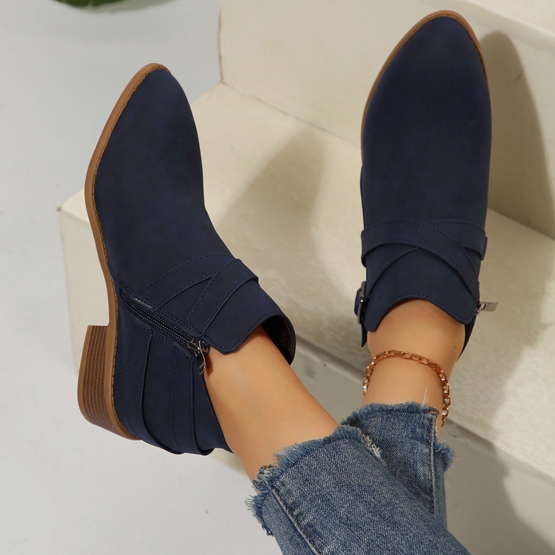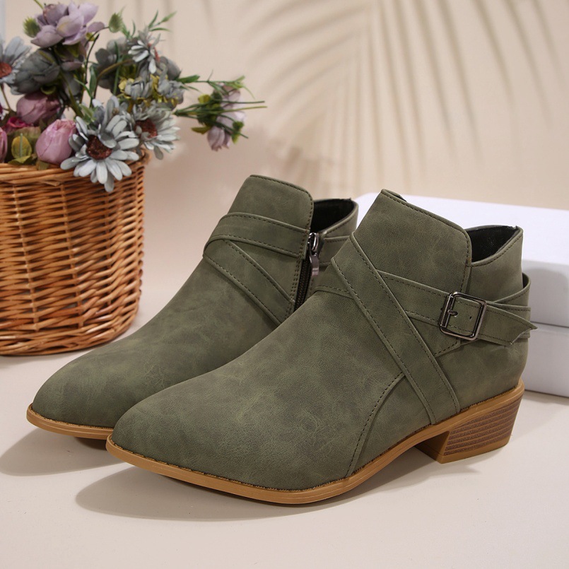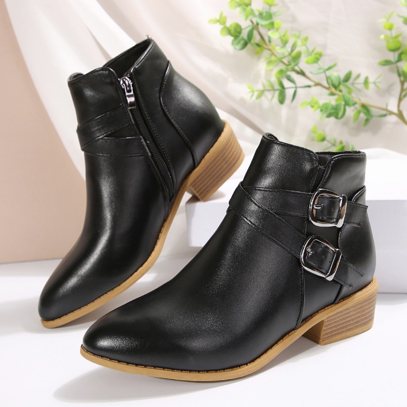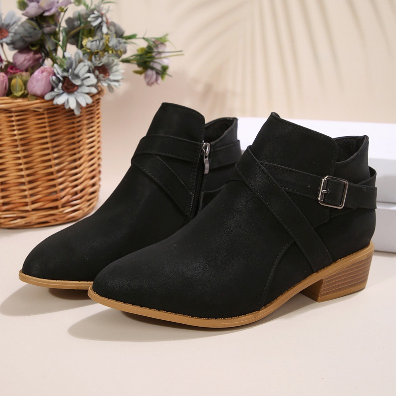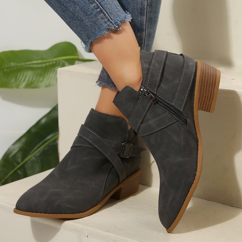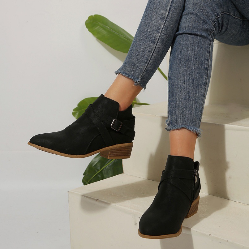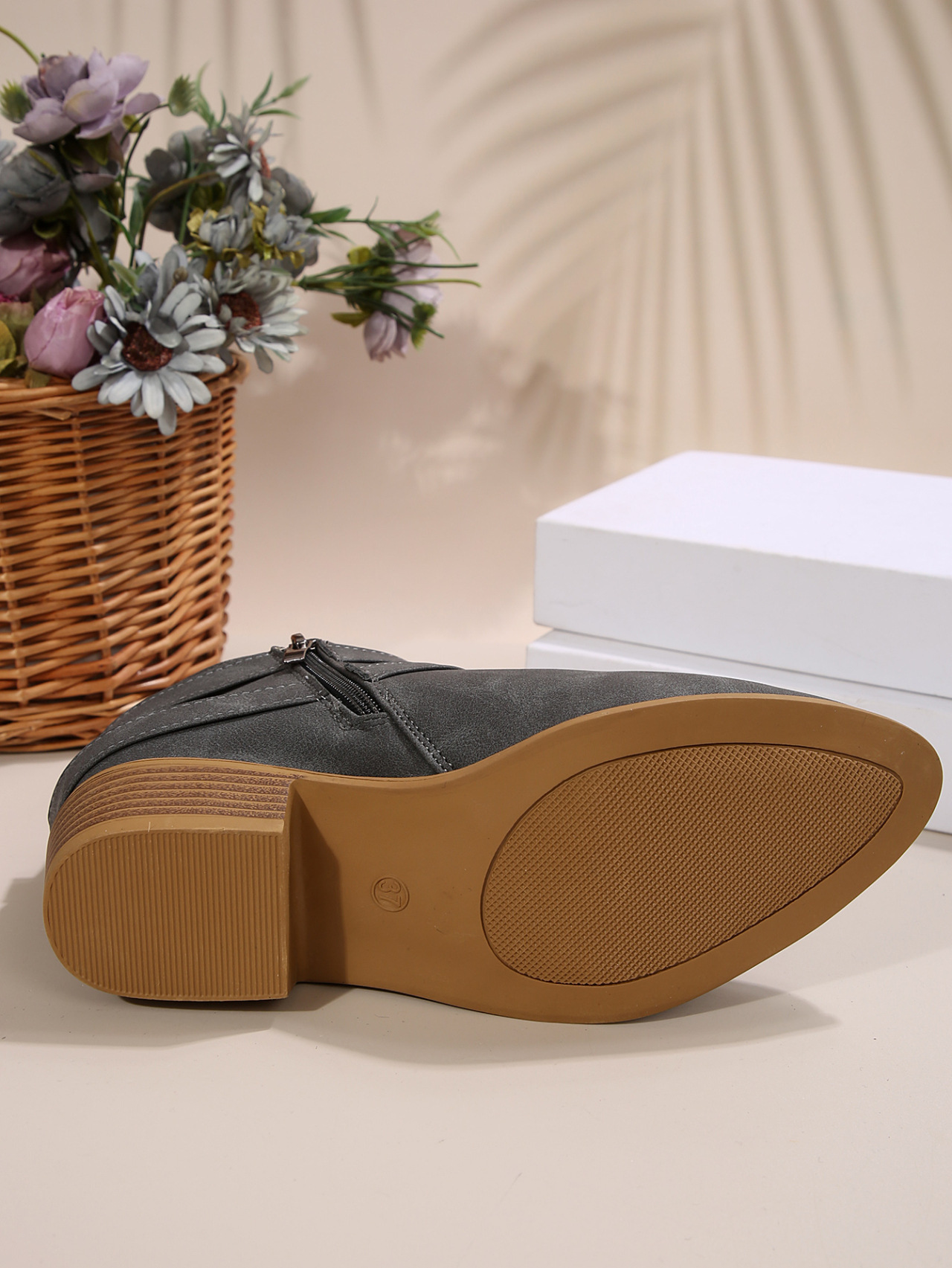 Fashionable Chunky-Heel Leather Belt-Clasp Side-Zip Ankle Boots